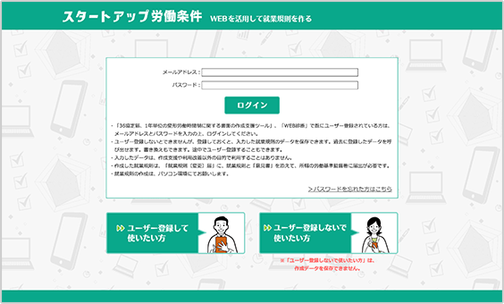 本ページまたは「就業規則について」ページにある「作成支援ツールはこちら」ボタンを押すと、就業規則作成支援ツールのログイン画面に移動します。「36協定届・1年単位の変形労働時間制に関する書面の作成支援ツール」、「WEB診断」に登録されている方は、メールアドレスとパスワードを入力し、ログインしてください。