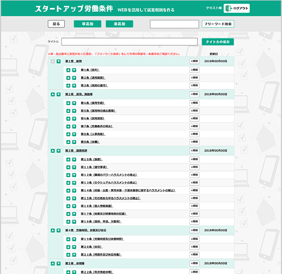 章・条の掲載順の変更や削除をしたり、削除済の章・条を追加できるほか、フリー項目を選択すれば章・条を自由に記述することもできます。